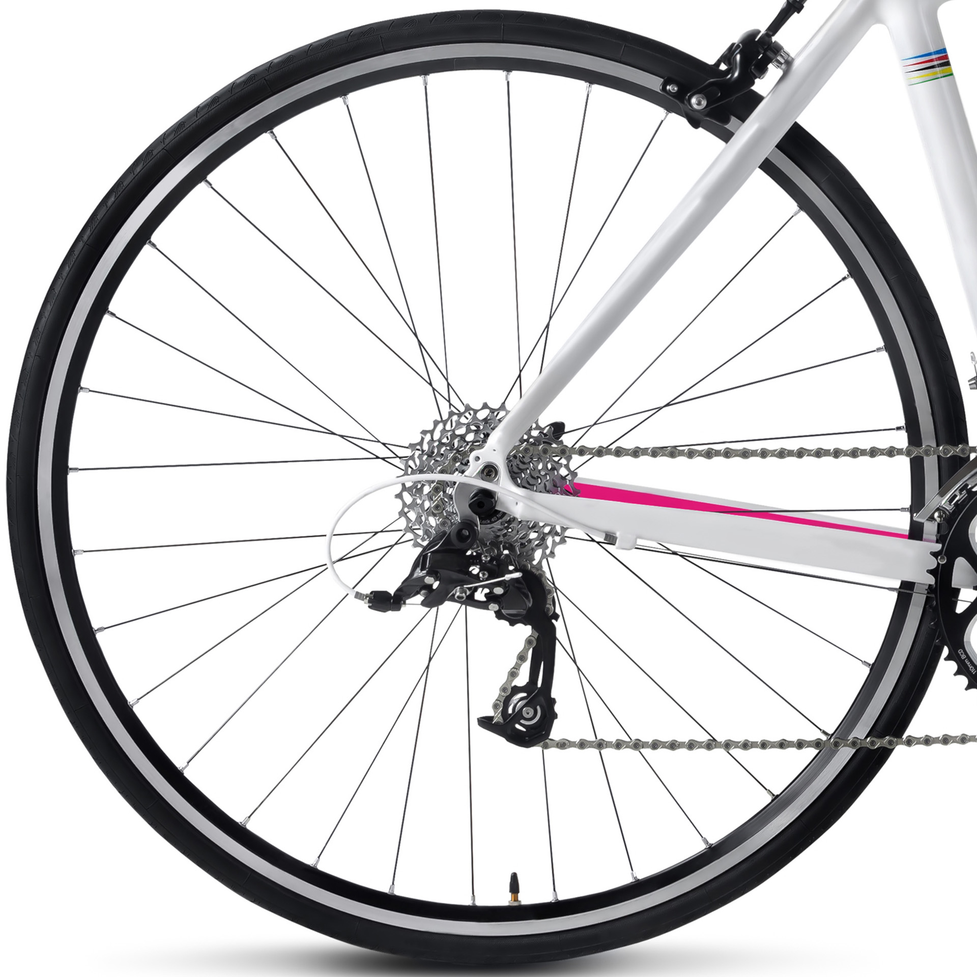 Race along the flats and smash any hill in your path with this super-fast bike! Shimano Tiagra compact cranks and 12/25T 9-speed cassette give you plenty of low gears for chewing up mountains without compromising speed when the road levels out.